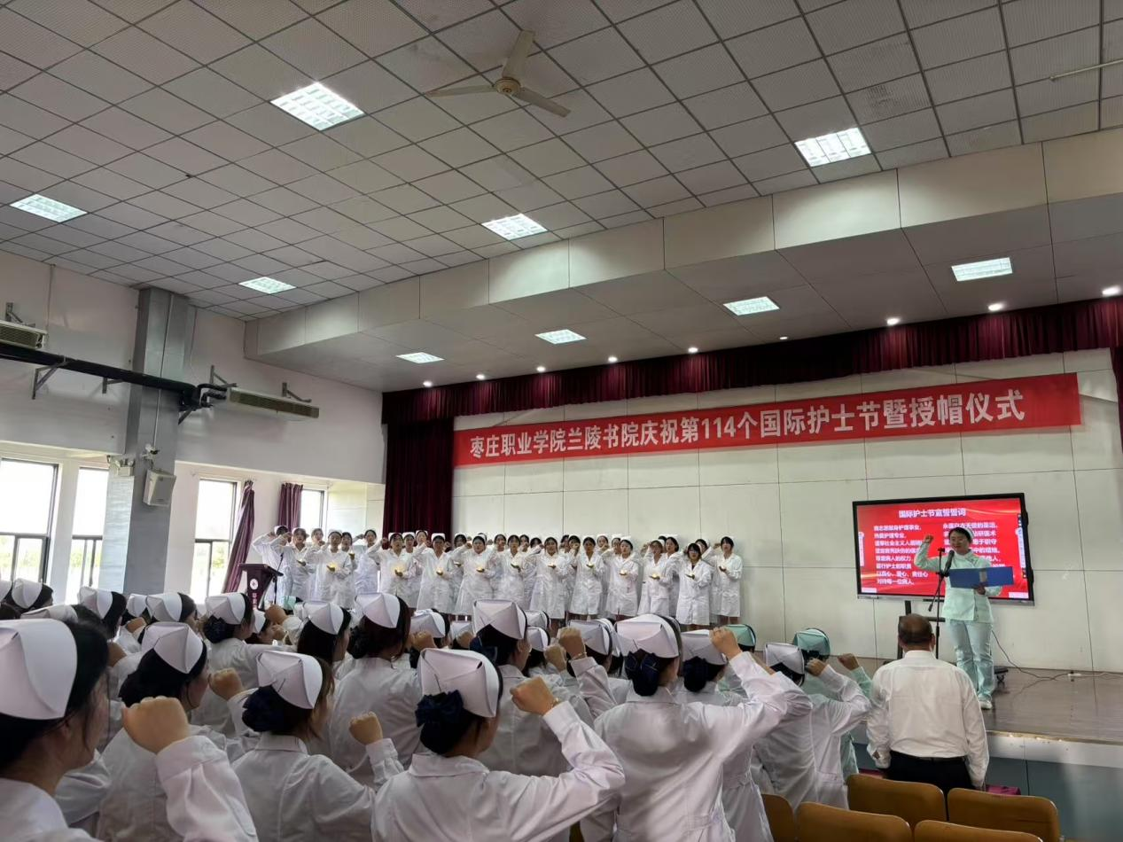 5月12日国际护士节,兰陵书院护理专业新生授帽仪式隆重举行,兰陵书院院长主持仪式,党支部书记致辞,台儿庄区三家医院护理骨干共同见证这一神圣时刻。