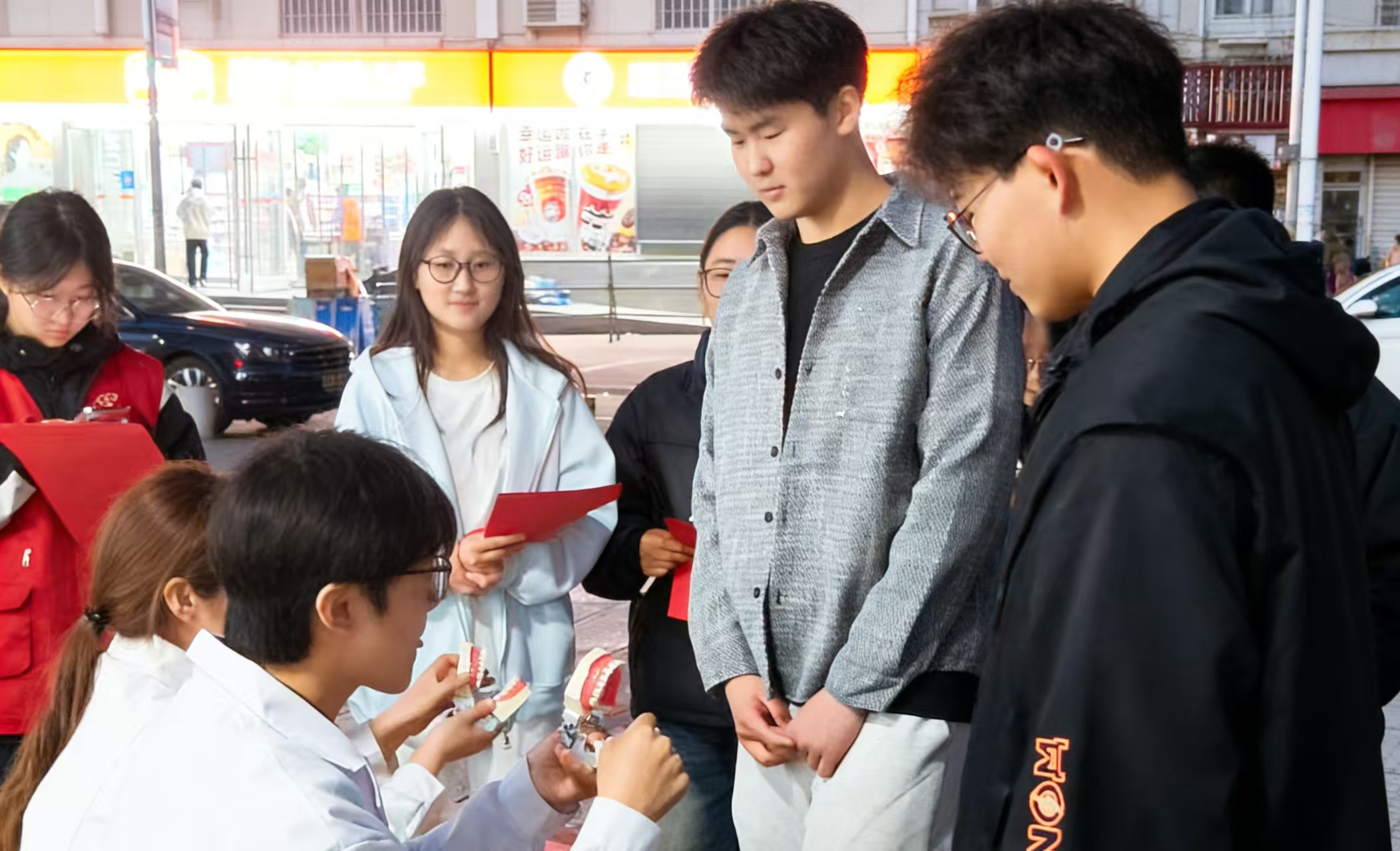本次活动在食堂门口开展,通过发放宣传单、现场科普宣讲以及有关牙齿健康主题演讲等多元形式,实现校园健康知识全覆盖。志愿者们围绕校园高发口腔问题展开细致讲解,针对龋齿蛀牙、口臭、牙结石及口腔溃疡等师生常见困扰,结合日常学习生活习惯,深入剖析致病根源:爱吃甜食、常喝碳酸饮料易腐蚀牙齿,刷牙方法不当、饭后不漱口会导致牙菌斑堆积,单侧咀嚼、挑食等不良习惯,也会损伤牙齿、引发口腔疾病。同时强调口腔问题不仅影响美观与进食,更会危害全身健康。为让科普知识落地实用,志愿者重点讲解了口腔防护要点,示范巴氏刷牙法,指导师生选用软毛牙刷与含氟牙膏,掌握科学刷牙步骤,纠正错误刷牙方式,倡导定期检查牙齿、及时养护,将“预防为主”的理念深入人心。最后,活动在轻松、和谐的氛围中圆满结束。