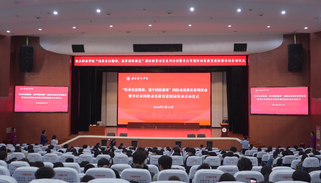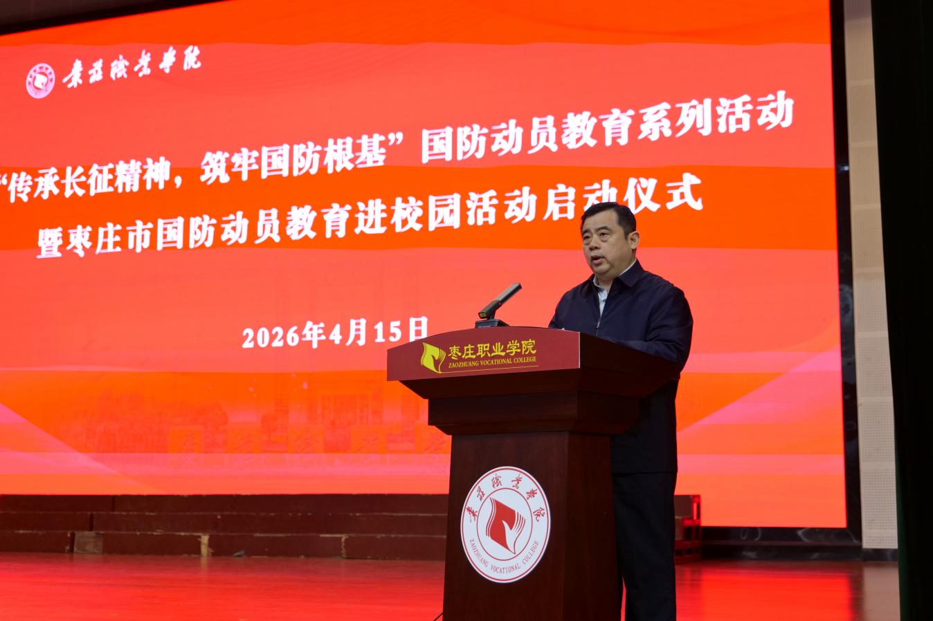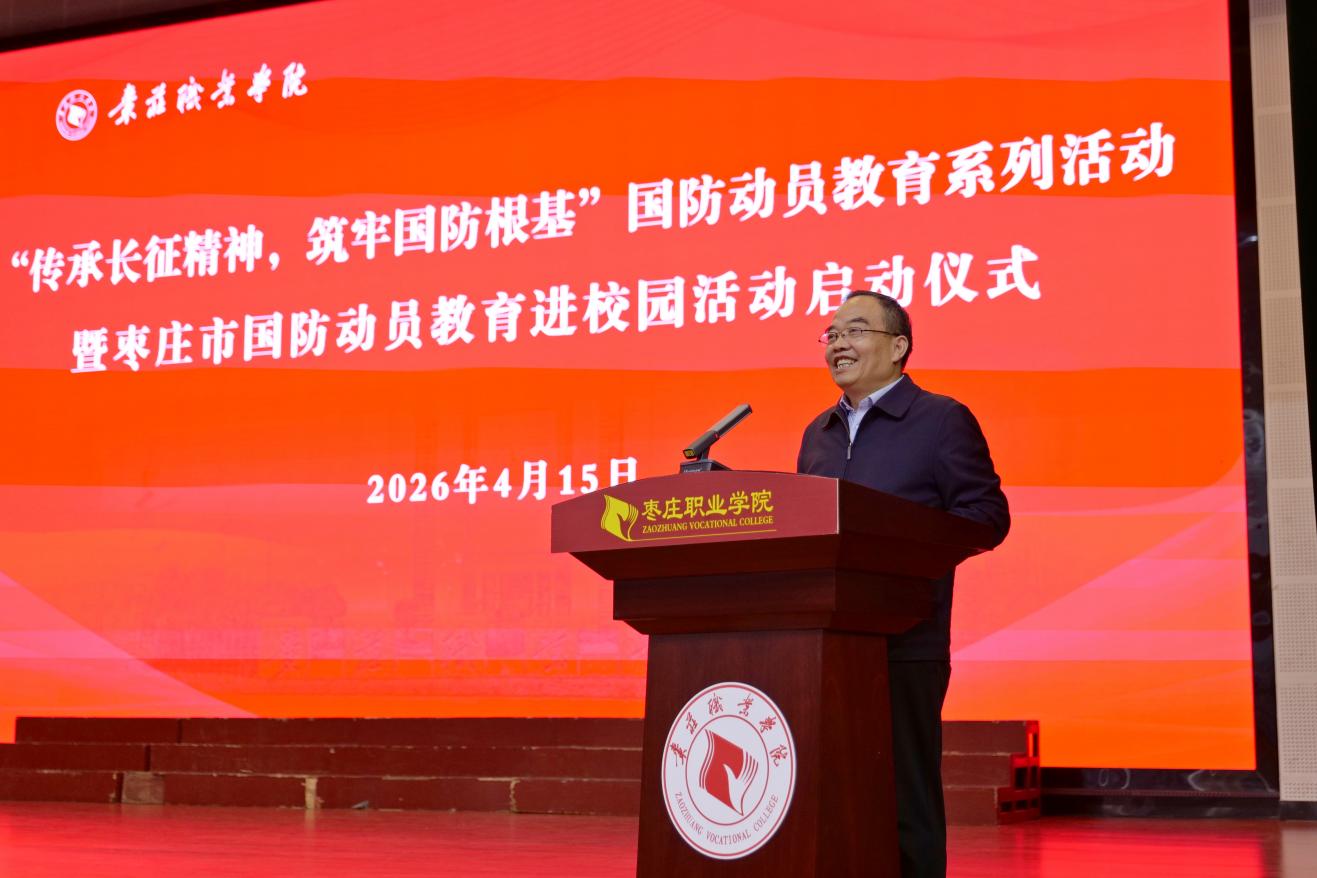 4月15日下午,我校举行“传承长征精神,筑牢国防根基” 国防动员教育系列活动暨枣庄市国防动员教育进校园活动启动仪式。枣庄市国动办党组书记、常务副主任、市人防办主任高淦出席仪式,枣庄职业学院党委书记郝荣平主持仪式并讲话。市人防办原党组成员、副主任、二级调研员王继启,市国动办党组成员、副主任冯君昌和市国动办各处室负责同志,学校各系(院)负责人、学生管理负责同志、专职辅导员和学生代表等600余人参加仪式。